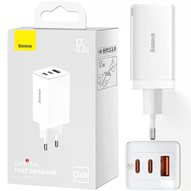 Блок живлення 65 W Baseus для швидкого заряджання Мережевий зарядний пристрій 65 ватів GaN5 Pro кабель 100 W Type-C White