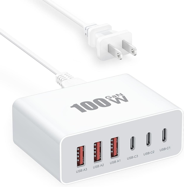 USB-C зарядний блок UVRESINME 100W, GaN швидка зарядка, 6 портів (3 USB-C + 3 USB-A), подовжувач 1,5 м