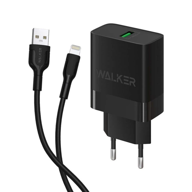 Мережевий зарядний пристрій зі швидкою зарядкою WALKER WH-35 (1USB, QC3.0, 3A, 15W + Lightning cable) black