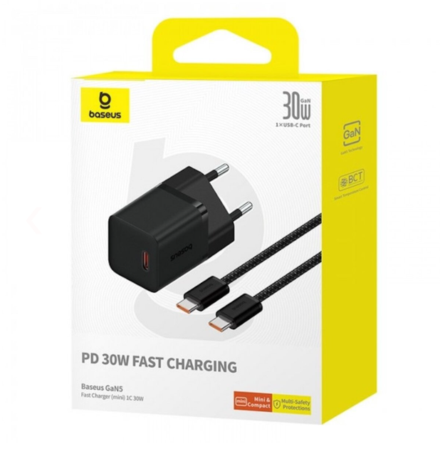 Мережевий зарядний пристрій з кабелем Baseus GaN5 Fast Charger(mini) 1C 30W EU Cluster Black new