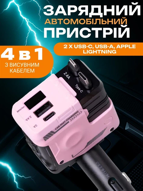 Автомобільний зарядний пристрій для телефону 4 в 1 з висувним кабелем MECHA швидка зарядка в прикурювач USB/Type-C Рожевий