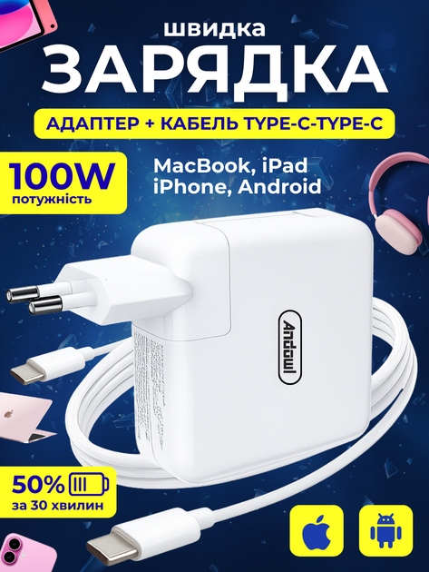 Універсальна швидка зарядка type-c 100w для макбука айфона телефону айпада андроіда Andowl Q-KC03X1 потужний зарядний пристр
