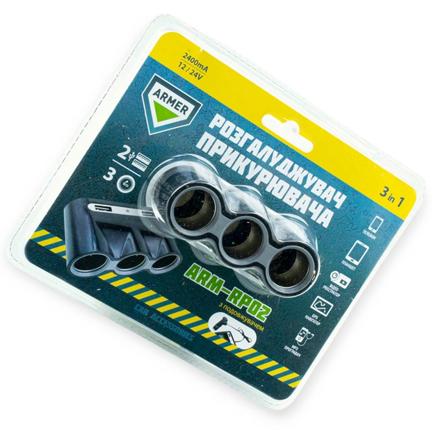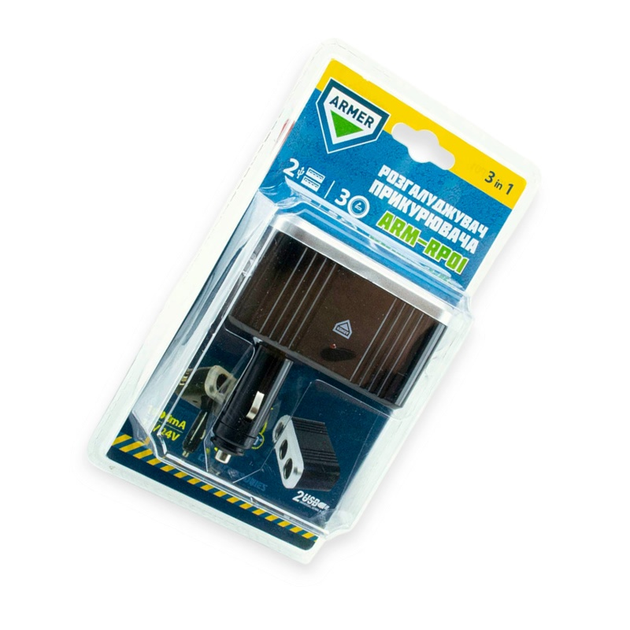 Розгалужувач прикурювача 3 вих. 5А, 60Вт, 2 USB 1.0А, Євро ARMER