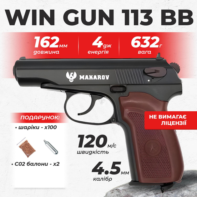 Пневматичний пістолет WinGun 113 Blowback Пістолет Макарова, метал з со2 з кулями