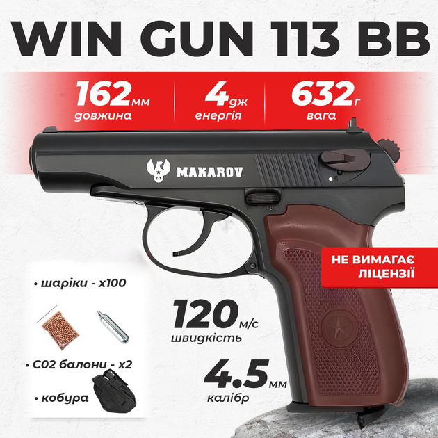 Пневматичний пістолет WinGun 113 Blowback Пістолет Макарова, метал з со2 з кулями з кобурою