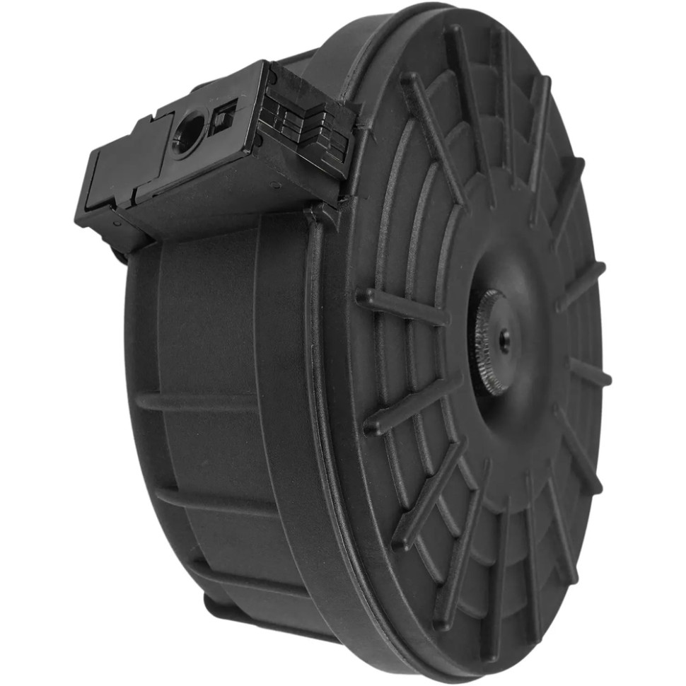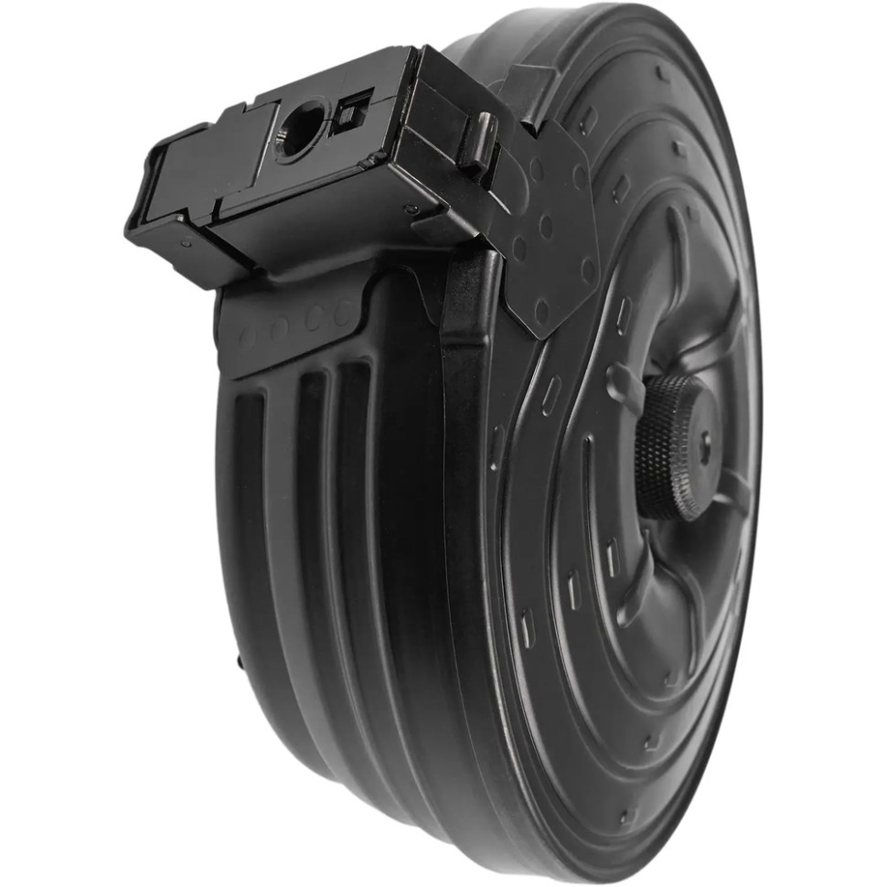 LCT PK-381 - стальной электробункерный барабанный магазин черного цвета, емкостью 2000 BB-шариков, для страйкбольных приводов серии РПК (подходит и к другим приводам серии АК). Оснащен моторизованным механизмом с электрической подачей, питается от трех батареек типа AA.