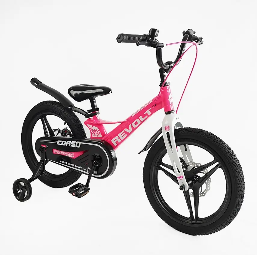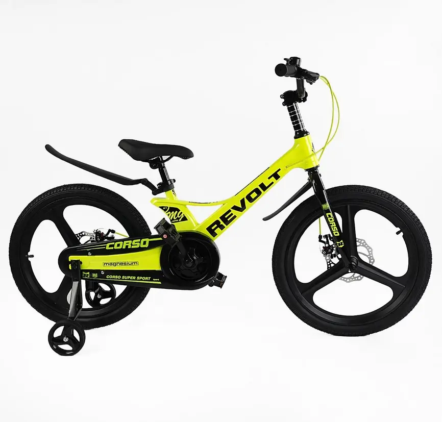 Від 6 років Дитячий двоколісний велосипед Corso Revolt з суперлегкою магнієвою рамою, литими магнієвими дисками, дисковими гальмами та якісним обладнанням сприятиме розвитку координації рухів та вмінню тримати рівновагу. Для абсолютної безпеки велосипеда передбачений повний захист ланцюга та дискові гальма. У нашому магазині Ви можете купити велосипед Corso Revolt та навчити