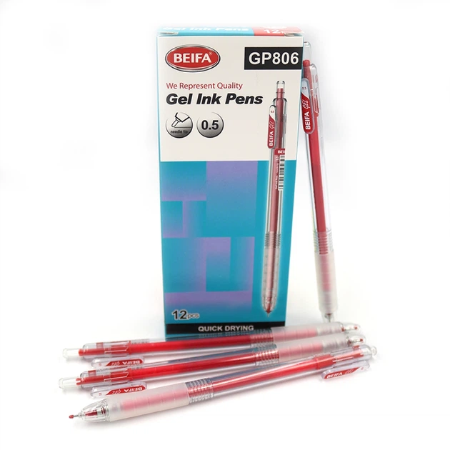 Набір гелевих ручок автоматична Beifa, 0.5 мм, швидко висихає, червона, 12 шт.