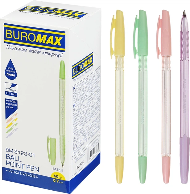 Набір ручок Buromax Simple кулькові 0.7 мм Сині корпус асорті 50 шт (BM.8123-01)