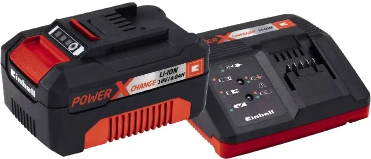 ---------------> Набір акумулятора та зарядного пристрою Einhell Starter Kit PXC, 1х18V, 4Аг Акумулятор + зарядний пристрій Einhell 18V 4.0 Ah PXC PLUS Starter Kit відноситься до сімейства Power X-Change. Комплект забезпечує живлення понад 200 бездротових інструментів. Один базовий літій-іонний акумулятор та один зарядний пристрій сумісні практично з усіма інструментами лінійки Power X-Change system.