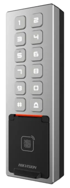 Hikvision DS-K1T642M - накладний термінал доступу, що використовує алгоритми розпізнавання облич, а також зчитувач Mifare. Зручний для контролю над входом у будівлі та окремі кімнати. Розміщується усередині приміщень. Панель Hikvision підключається до замків та дверних датчиків, автоматично активуючи їх при спрацьовуванні. У системі можна зберегти до 10 000 карт. За допомогою двох відеокамер