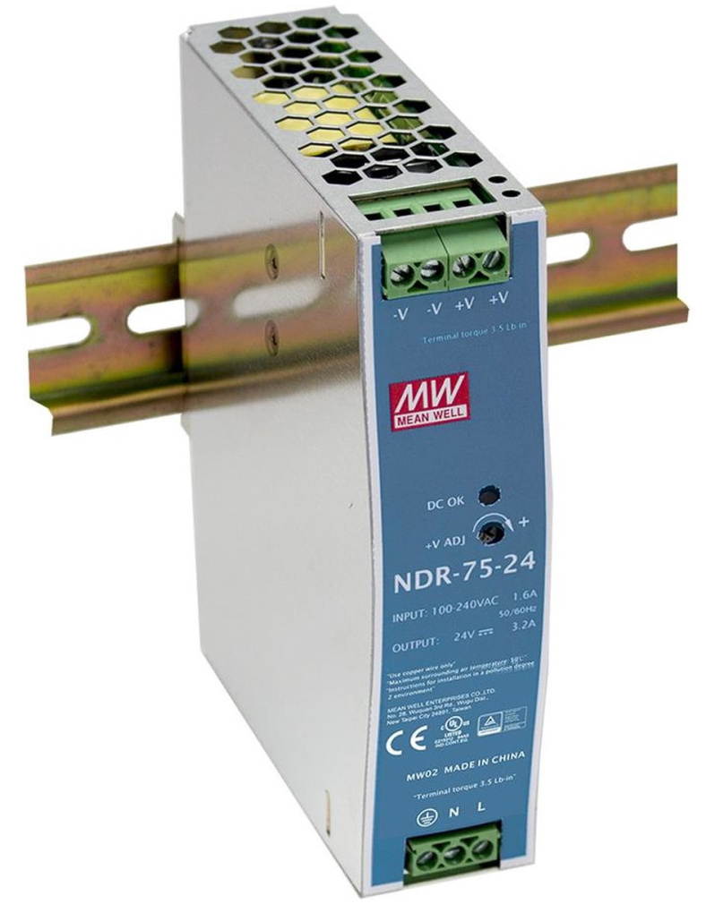 Mean Well NDR-75-12 - блок живлення перфорованого типу призначений для стабільного електроживлення пристроїв у системах відеоспостереження. Забезпечує вихідну напругу 12 В та струм 6,3 А, що дозволяє підключати пристрої загальною потужністю до 75,6 Вт. Оснащений світлодіодною індикацією, яка сигналізує про робочий стан. Завдяки виконанню на DIN-рейку, блок живлення зручний для встановлення