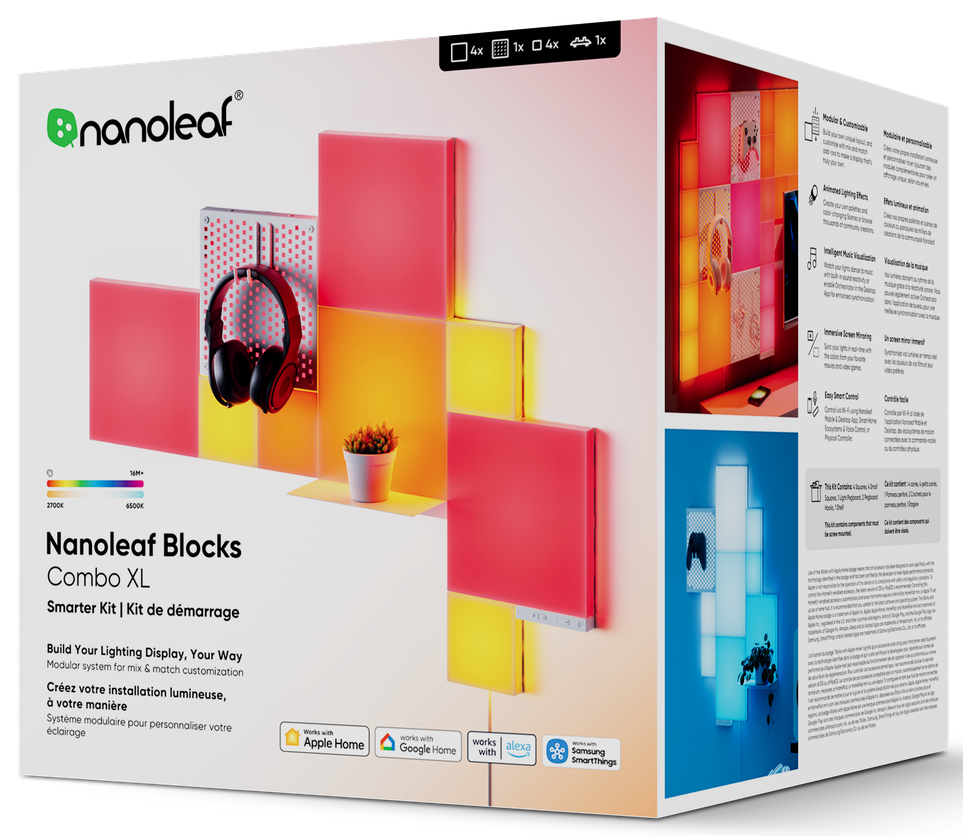 Розумні світлові панелі Nanoleaf Blocks Combo XL з підтримкою HomeKit і Matter - 9 шт. (N8100K02-10CB) — це набір із 9 квадратних світлових панелей, які з’єднуються між собою та формують оригінальну світлову інсталяцію, що слугує не лише джерелом освітлення, а й полицею для зберігання улюблених речей. Панелі світяться рівномірно по всій поверхні без затемнень на краях, забезпечуючи м’який та насичений
