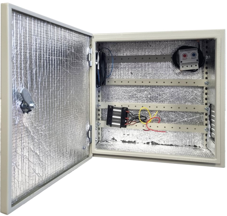 Кліматична всепогодна шафа 400х400х200 – ще один пристрій, розроблений компанією EServer. Шафа утеплена алюфомом товщиною 8 міліметрів. Має обігрівач, потужністю 200 ват. А також - вентилятор охолодження 120 міліметрів. В конструкції передбачено місце для встановлення ще одного вентилятора, якщо виникне така потреба. Обігрів та охолодження налаштовуються за допомогою відповідних