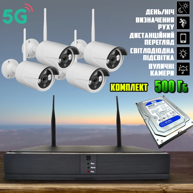 Комплект WiFi IP відеоспостереження бездротової Easy eye DVR 5G 8806IL3-4 KIT HD 4 камери з реєстратором + жорсткий диск 500