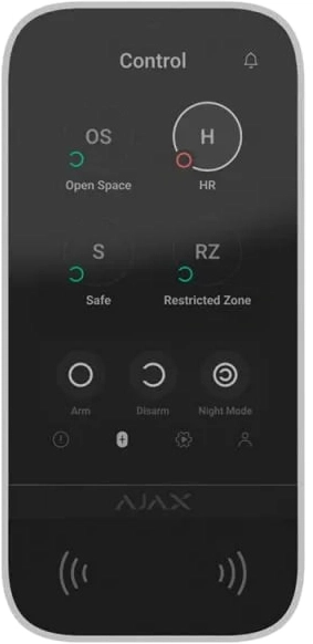 Клавіатура Ajax KeyPad TouchScreen успадковує інтерфейс додатків для смартфонів Ajax, забезпечуючи просту і знайому систему контролю. 5-дюймовий сенсорний екран дозволяє швидко отримати доступ до поточного режиму безпеки будь-якої групи. Він активується при піднесенні руки і має автоматичне регулювання яскравості. Особливості Клавіатура має звукову індикацію і може сповіщати про тривоги,