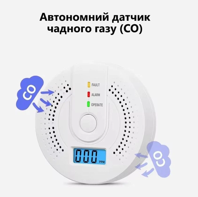 Автономний датчик чадного газу CO з LCD дисплеєм | Висока чутливість | Звукова та світлова сигналізація | UL2034