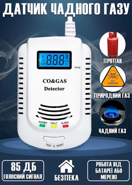 Датчик 2в1 природного газу (метан, пропан) + чадного газу СО FD808COM із сиреною