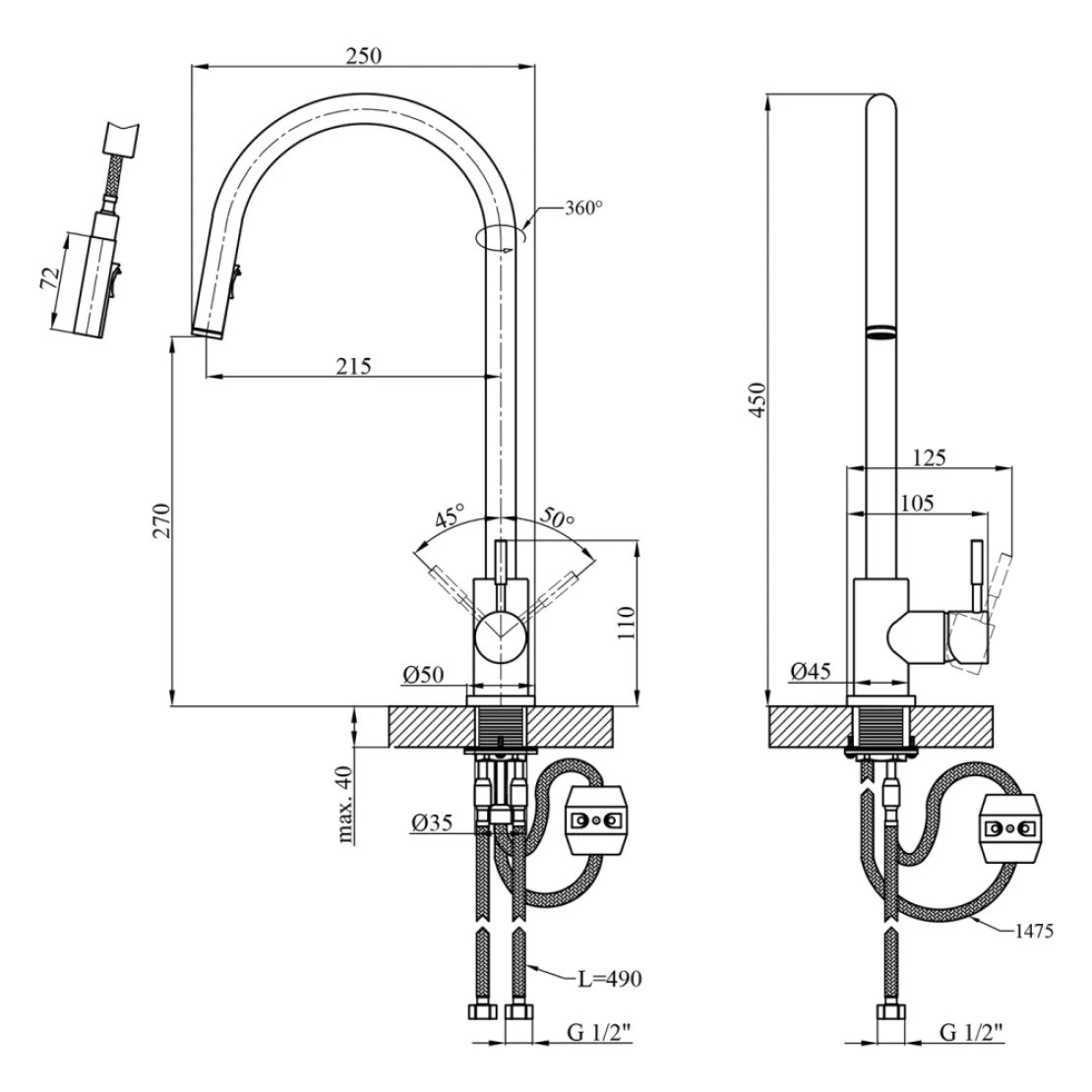 Смеситель для кухни с выдвижным изливом Kroner KRP Edelstahl Klassisch - ESG03917 представляет собой стильное и функциональное решение для вашей кухни. Основные характеристики: Серия: Edelstahl Klassisch. Назначение: Для кухни. Тип управления: Однорычажный. Материал: Нержавеющая сталь. Способ монтажа: Врезной. Тип крепления: Гайка. Тип подвода воды: Гибкий 1/2". Цвет: Нержавеющая сталь. Поверхность:
