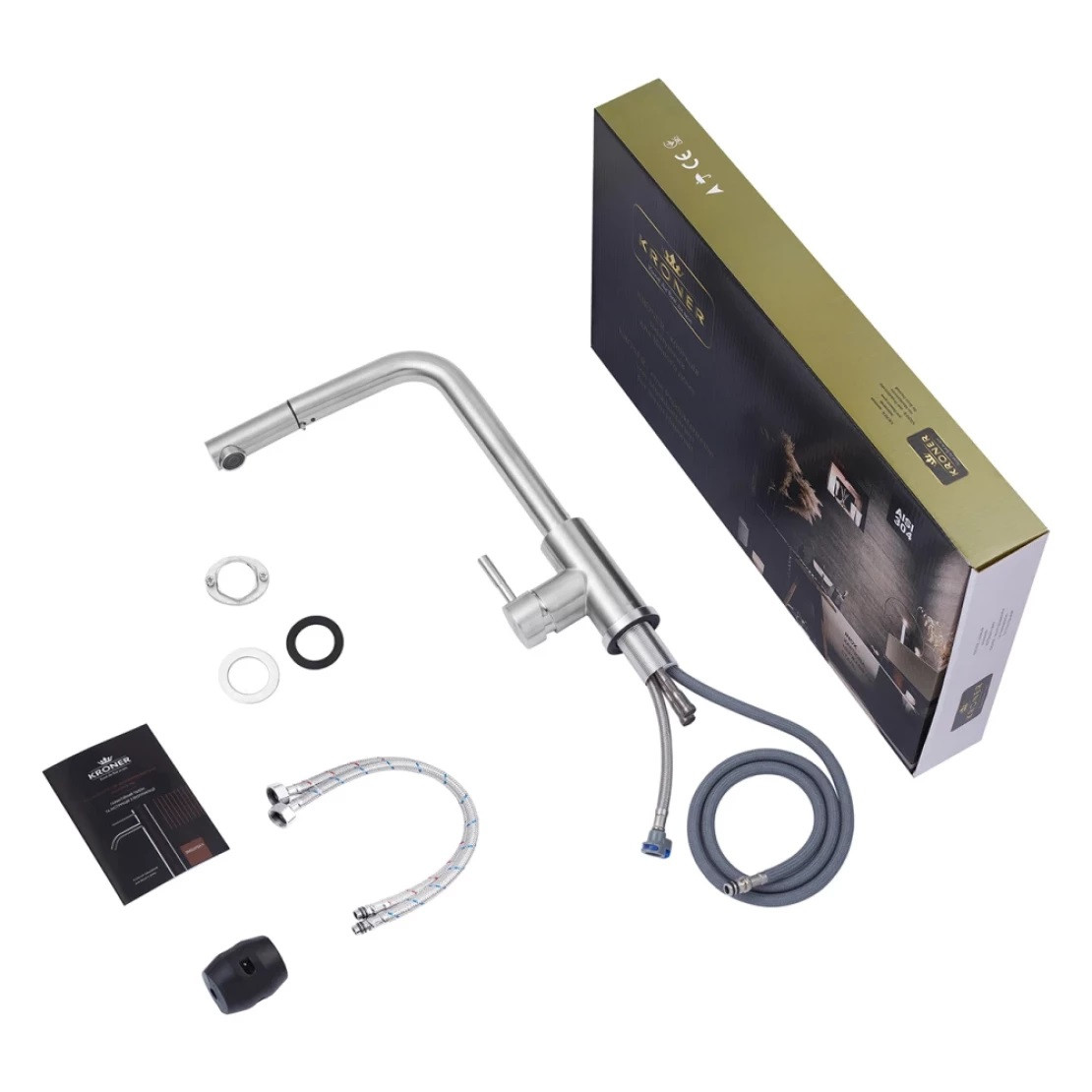 Смеситель для кухни с выдвижным изливом Kroner KRP Edelstahl Klassisch - ESG03915. Смеситель для кухни Kroner KRP Edelstahl Klassisch – ESG03915 – это изысканное изделие из нержавеющей стали, сочетающее в себе эстетику и функциональность. Отлично подойдет для современных кухонь. Благодаря однорычажному управлению и врезному способу монтажа, он легко интегрируется в ваше пространство. Брашированная поверхность и
