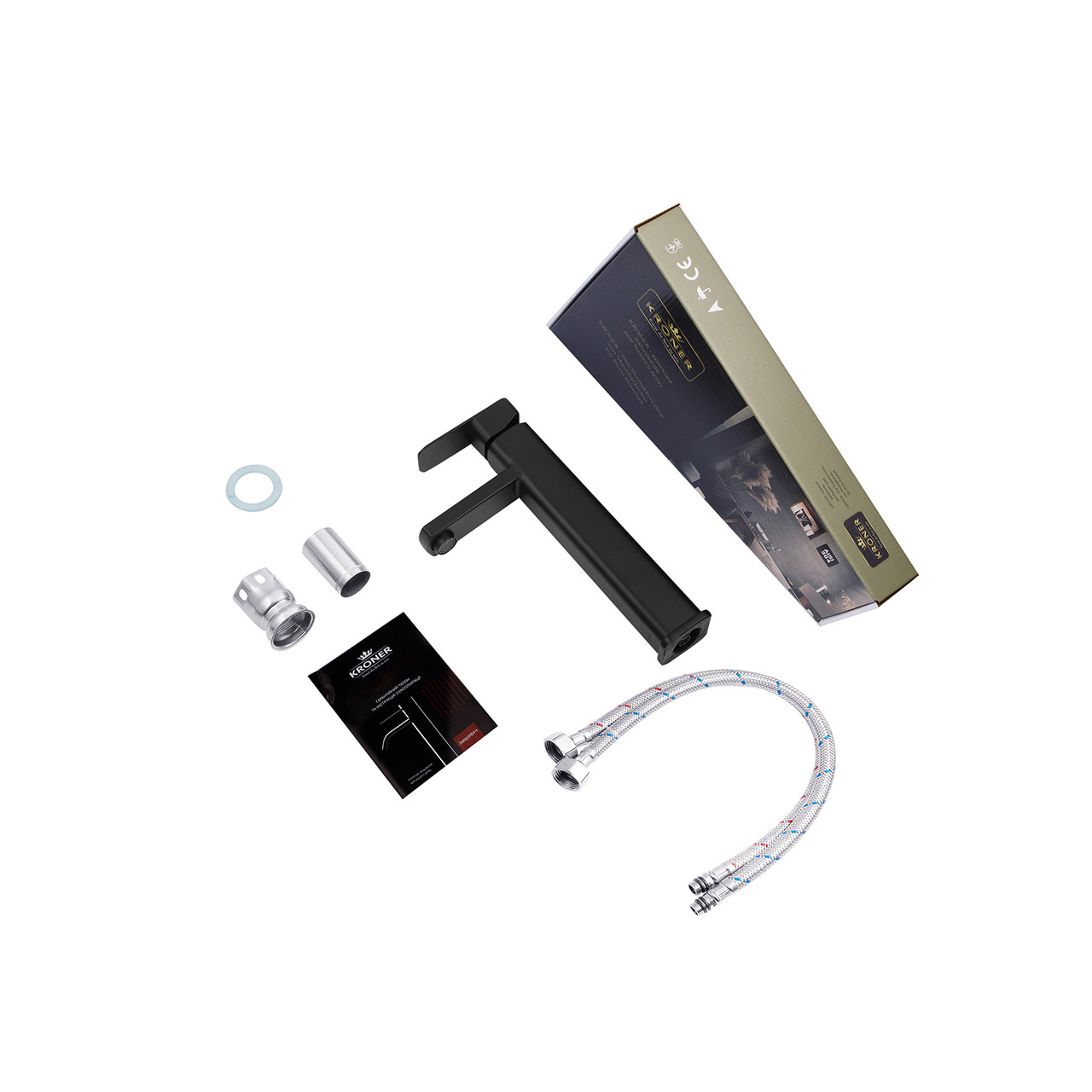 Смеситель для раковины Kroner KRP Edelstahl Kubus - SCH010-3: современный стиль и функциональность в одном образе. Высокий излив в 200 мм обеспечивает удобство использования, а его черный матовый цвет придает вашей ванной комнате элегантность и изысканность. Материал изготовления - нержавеющая сталь - гарантирует прочность и долгий срок службы. С однорычажным управлением и диаметром картриджа 35