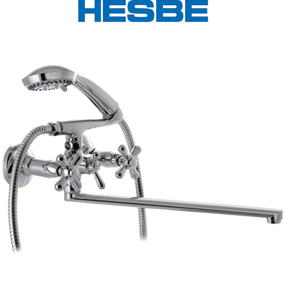 Змішувачі торгової марки HESBE виготовляються на німецькому устаткуванні з латуні найвищої якості. Контроль якості продукції HESBE здійснюється фахівцями з Німеччини. У виробництві використовуються іспанські картриджі та німецькі кран-букси. Латунний вентильний (кран-буксовий) змішувач для ванної кімнати з довгим поворотним носом, з душовим шлангом і лійкою в комплекті.