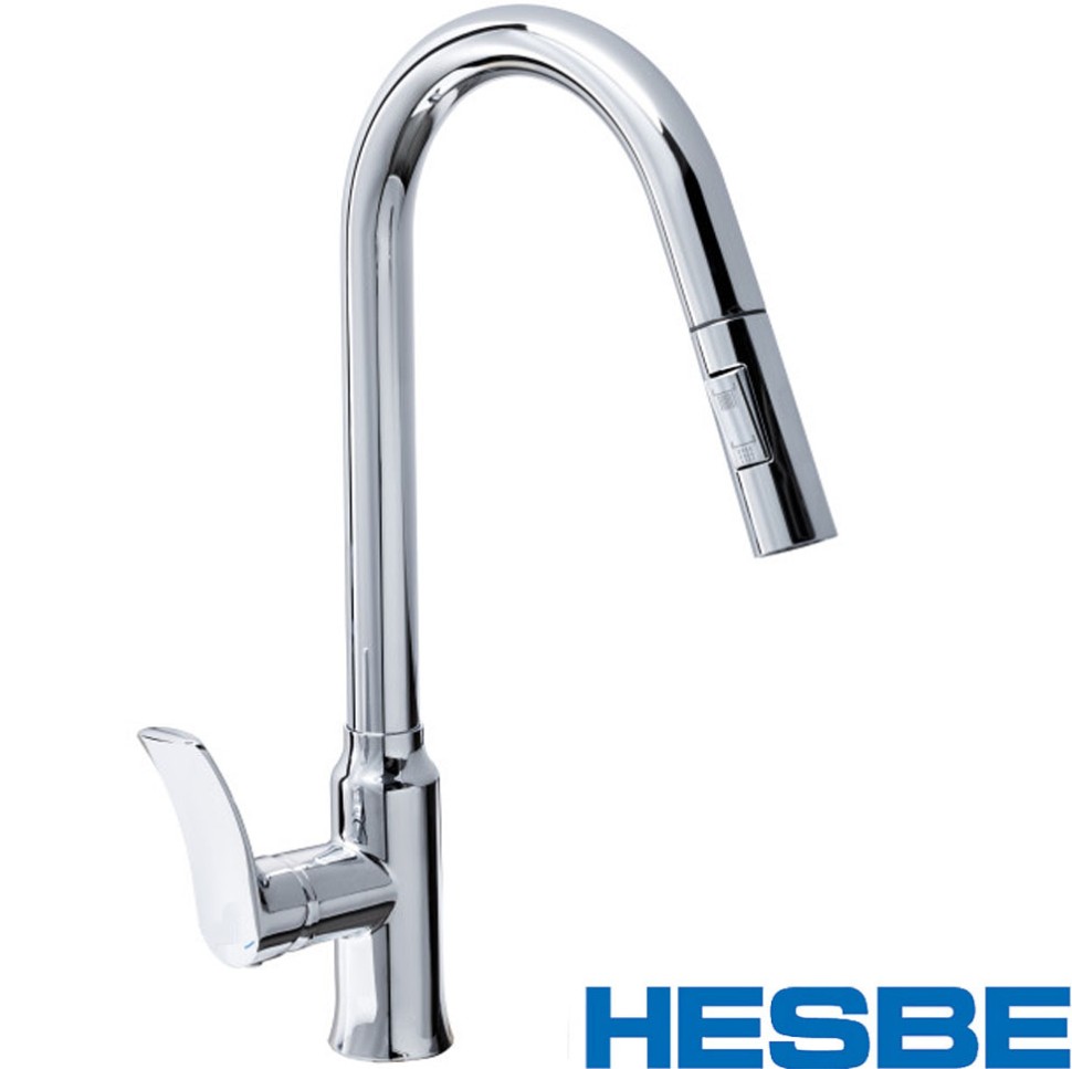Змішувачі торгової марки HESBE виготовляються на німецькому устаткуванні з латуні найвищої якості. Контроль якості продукції HESBE здійснюється фахівцями з Німеччини. У виробництві використовуються іспанські картриджі та німецькі кран-букси. Латунний картриджний змішувач для кухні з довгим поворотним носом, комплектується гнучким підведенням 45 см, кріплення шпилька. Змішувач