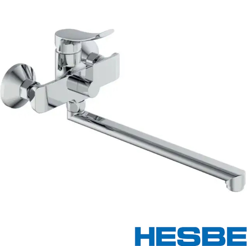 Змішувачі торгової марки HESBE виготовляються на німецькому устаткуванні з латуні найвищої якості. Контроль якості продукції HESBE здійснюється фахівцями з Німеччини. У виробництві використовуються іспанські картриджі та німецькі кран-букси. Латунний картриджний змішувач для ванної кімнати з довгим поворотним носом, з душовим шлангом і лійкою в комплекті. Змішувач призначений