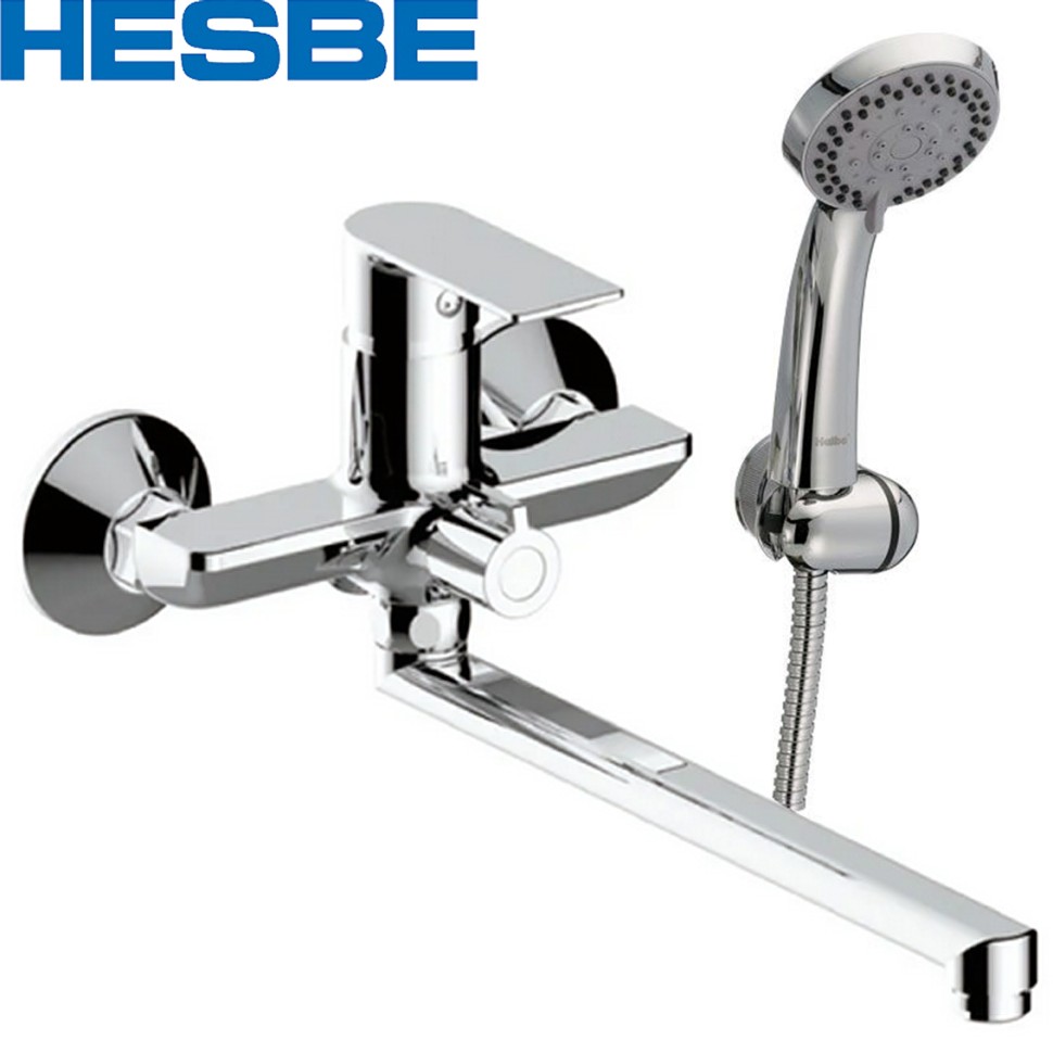 Змішувачі торгової марки HESBE виготовляються на німецькому устаткуванні з латуні найвищої якості. Контроль якості продукції HESBE здійснюється фахівцями з Німеччини. У виробництві використовуються іспанські картриджі та німецькі кран-букси. Латунний картриджний змішувач для ванної кімнати з довгим поворотним носом, з душовим шлангом і лійкою в комплекті. Змішувач призначений