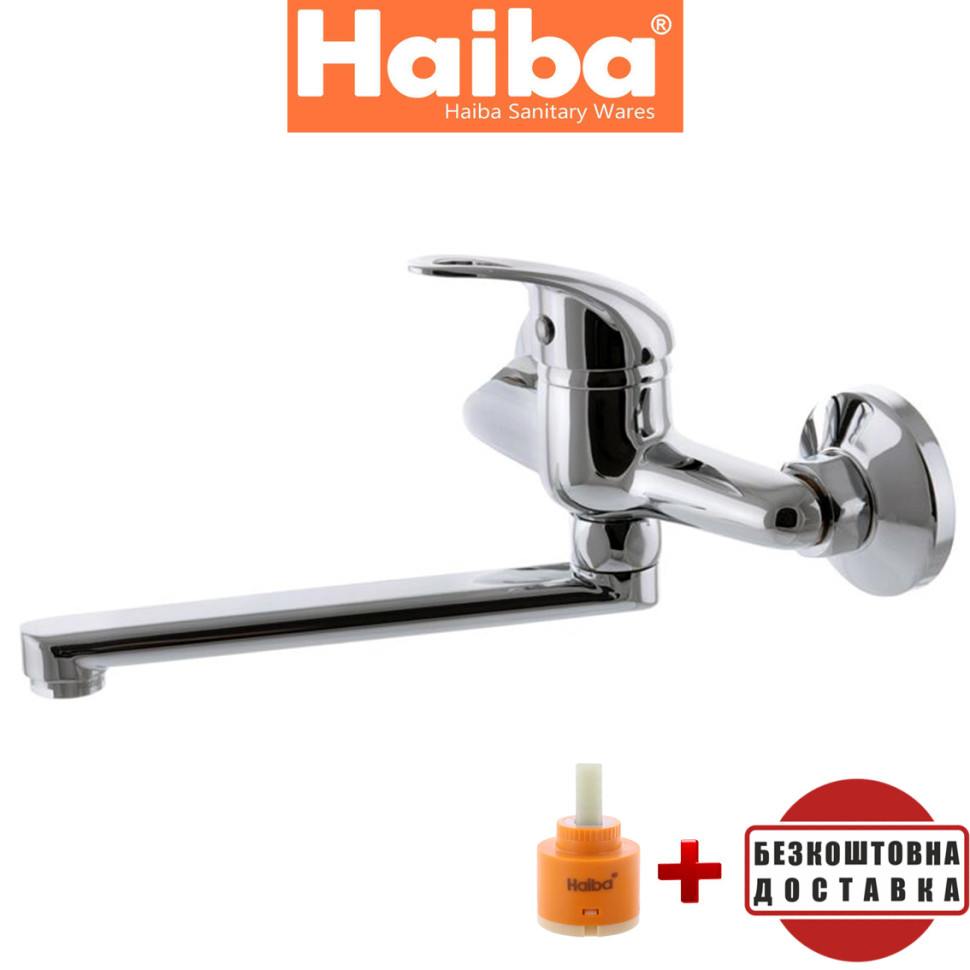 Змішувачі торгової марки HAIBA виготовляються на німецькому обладнанні з латуні найвищої якості. Контроль якості продукції HAIBA здійснюється фахівцями з Німеччини. У виробництві використовуються іспанські картриджі SEDAL та німецькі кран-букси. Латунний вентильний (кран-буксовий) змішувач для кухні від стіни з поворотним носом, довжина гуся 20 см. Змішувач призначений для