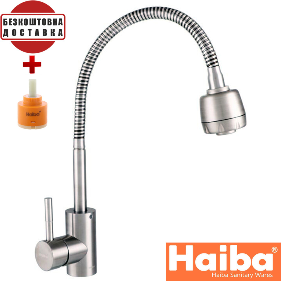 Змішувачі торгової марки HAIBA виготовляються на німецькому обладнанні з латуні найвищої якості. Контроль якості продукції HAIBA здійснюється фахівцями з Німеччини. У виробництві використовуються іспанські картриджі SEDAL та німецькі кран-букси. Латунний вентильний (кран-буксовий) змішувач для кухні з високим поворотним носом, комплектується гнучким підведенням 45 см, кріплення