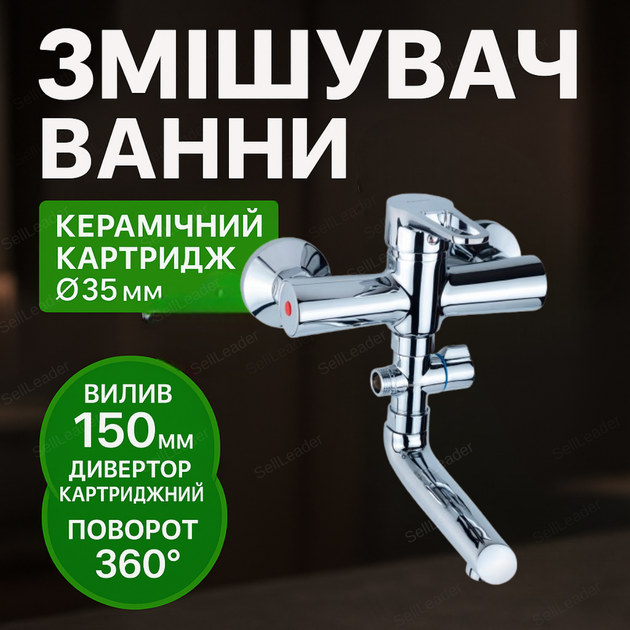 Змішувач HL 35 одноважільний для ванни кран гусак прямий настінний з душем 150мм хром дивертор Aquatica
