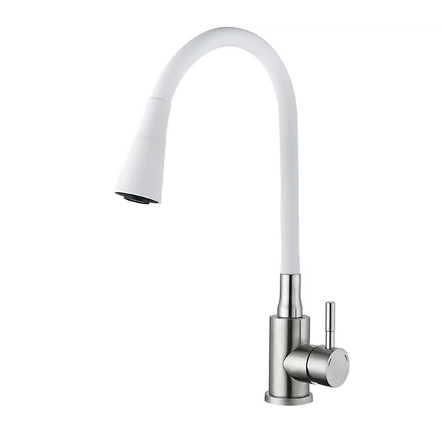 Змішувач для кухні WEZER EKO4Y-01W, гнучкий дворежимний вилив, нержавіюча сталь, сатин/білий