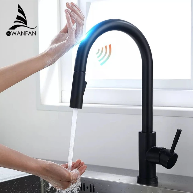 Розумний сенсорний змішувач для кухні WanFan з висувним виливом, кухонний кран з сенсорним датчиком, Чорний