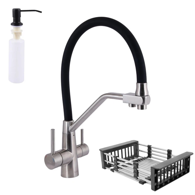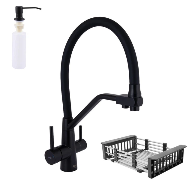 Змішувач для кухні Lidz Aria 020F3 з гнучким виливом і під'єднанням для питної води чорний, корзина та дозатор (39212)