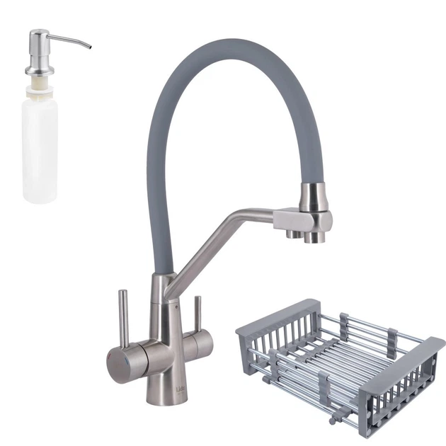 Змішувач для кухні Lidz Aria 020F3 з гнучким виливом і під'єднанням для питної води сірий, кошик і дозатор (39211)