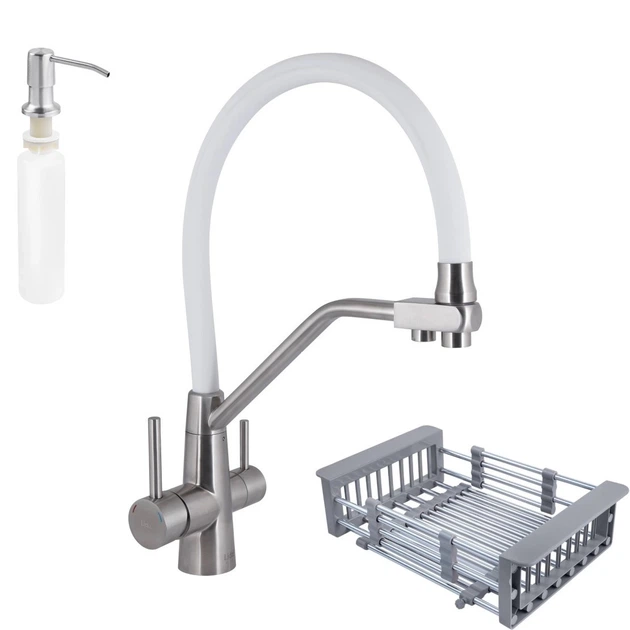 Змішувач для кухні Lidz Aria 020F3 з гнучким виливом і під'єднанням до питної води, білий і кошик і дозатор (39480)
