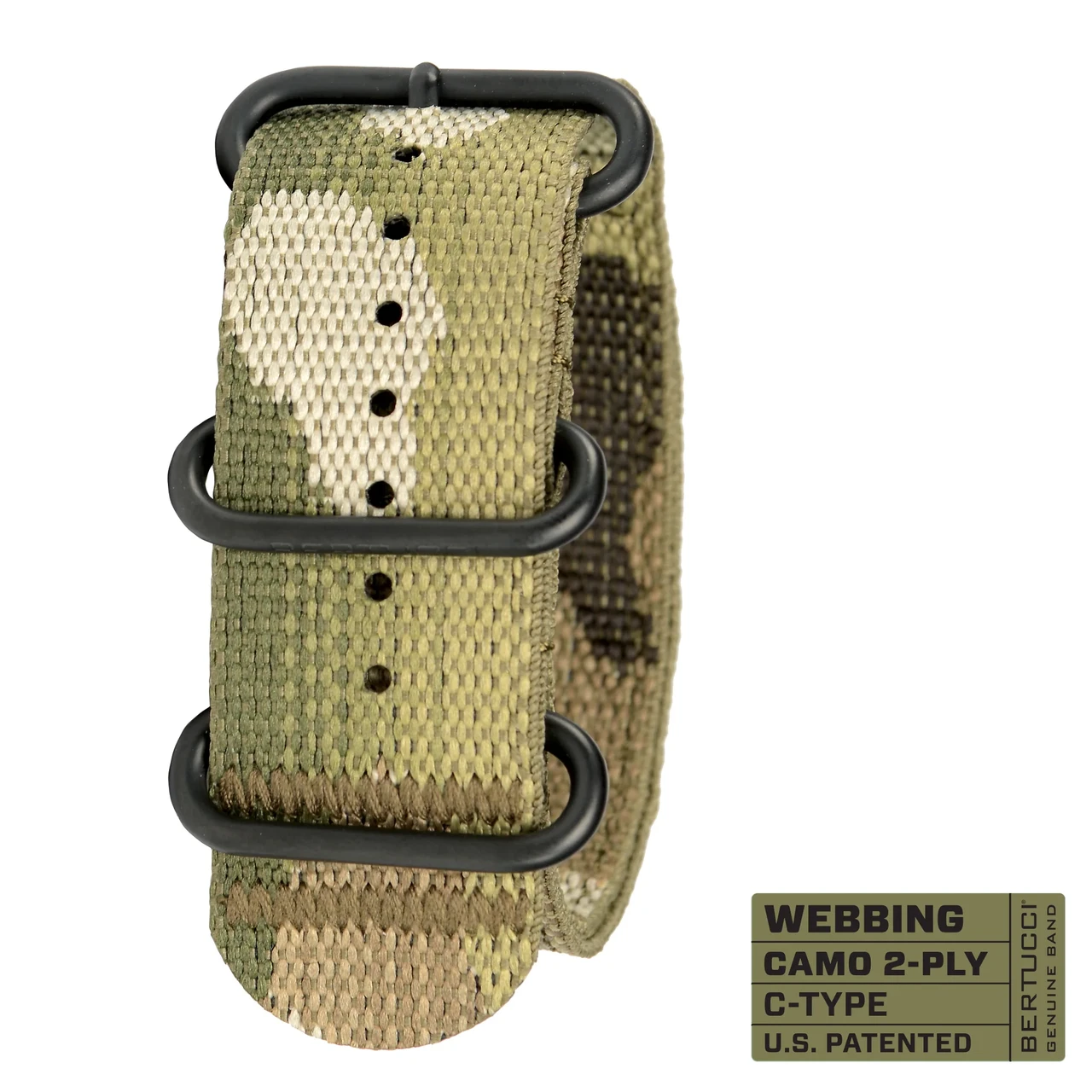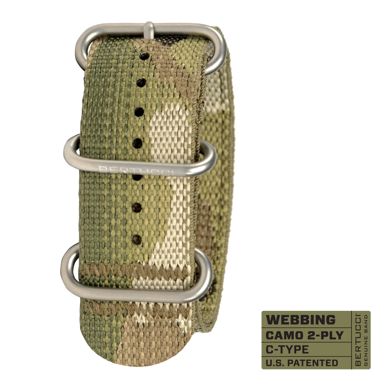 Ремінець нейлоновий bertucci #147 - Multicam w/ matte hardware, 1" - 26 mm size for A-4, A-5 & E-1 Cases МАГАЗИНЕ BEZEL ТІЛЬКО 100% ОРИГІНАЛЬНІ ЧАСИ C-TYPE Camo 2-Ply Webbing Band є виготовленою в США автентичною камуфляжною тасьмою військового стандарту США, в якій використовуються інноваційні матеріали та текстильна інженерія. Міцна запатентована в США конструкція з двошаровою конструкцією, міцною строчкою, матовою пряжкою з