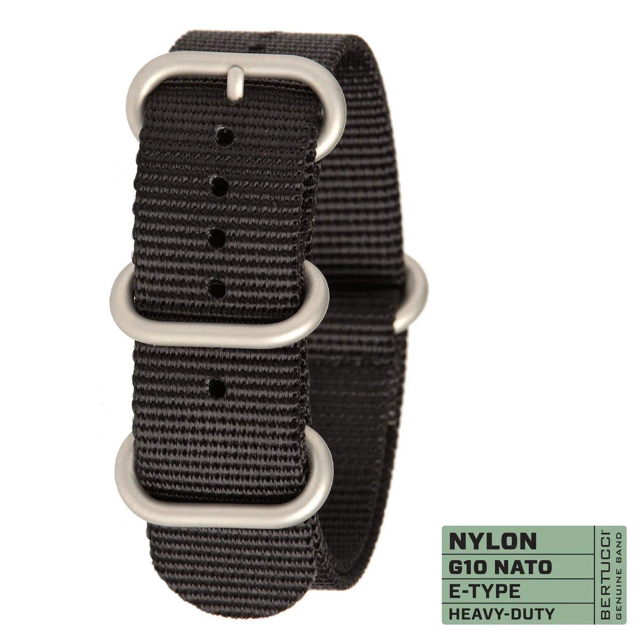Ремінець нейлоновий bertucci #185NS SHORT - NATO Black w/ matte hardware, 7/8" - 22 mm size for A-2, A-3, A-6 & B-1 Cases МАГАЗИНЕ BEZEL ТІЛЬКО 100% ОРИГІНАЛЬНІ ЧАСИ E-TYPE Heavy-Duty G10 NATO Nylon Webbing Band, який бере «традиційний НАТО» ремінець і посилює його за рахунок більш товстої цільнонейлонової конструкції та міцної матової фурнітури з нержавіючої сталі. Широкий діапазон регулювання забезпечує ідеальну посадку. Підходить для