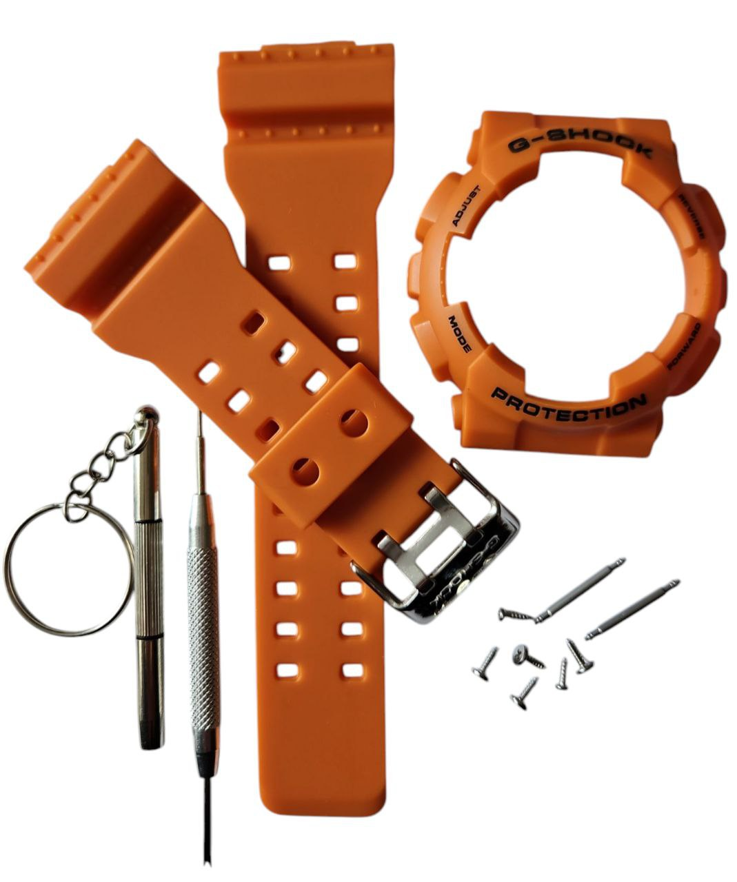 Комплект ремінець і безель / рант Жовтогарячого кольору з чорними надписами для годинника CASIO GA-100 В комплект входить ремінець, безель, інструмент для заміни. Характеристики ремінця Casio: Ширина ремінця в місці кріплення до годинників : 16 мм Широка частина в місці приєднання: 30 мм Довжина: 130+80 мм (без пряжки). Колір жовтогарячий матовий. Комплект підходить до наступних