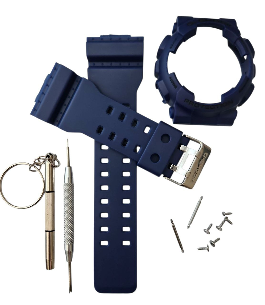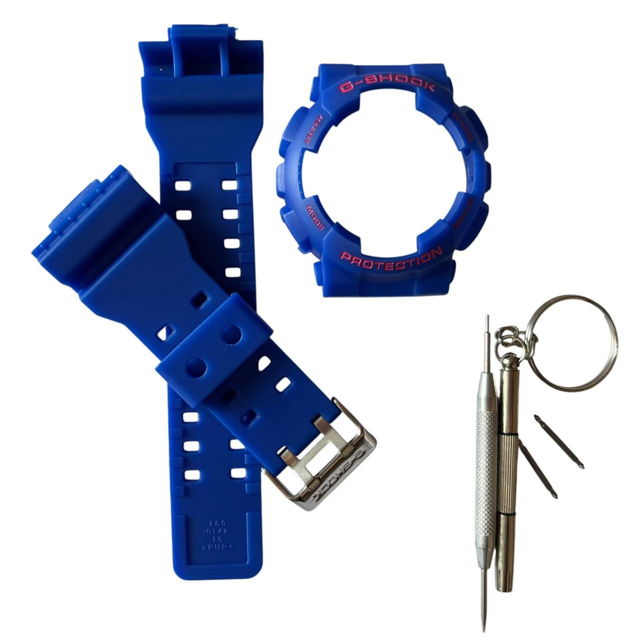 Комплект ремінець і безель / рант синього кольору з червоними надписами для годинника CASIO GA-100 В комплект входить ремінець, безель, інструмент для заміни. Характеристики ремінця Casio: Ширина ремінця в місці кріплення до годинників : 16 мм Широка частина в місці приєднання: 30 мм Довжина: 130+80 мм (без пряжки). Колір синий Комплект підходить до наступних моделей годинників CASIO :