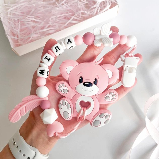Іменний силіконовий прорізувач для зубів, Єнот Роза кварц, для малюка