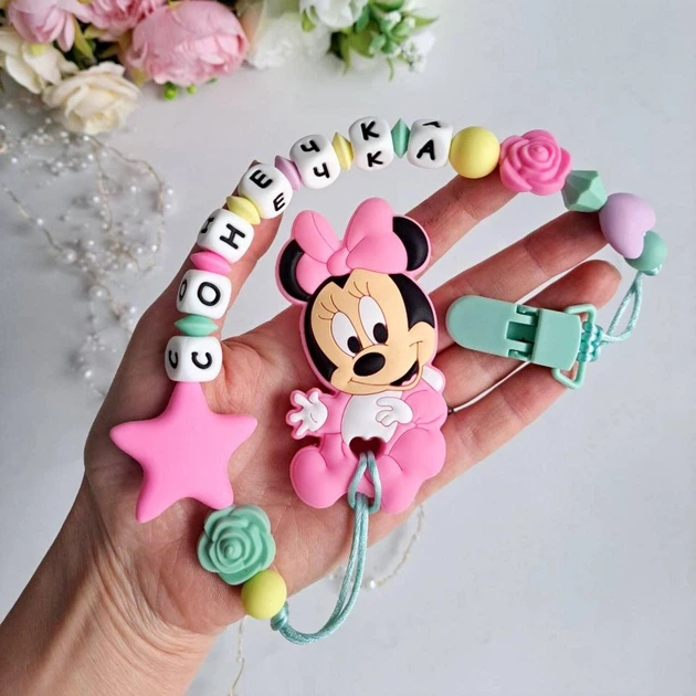 Іменний силіконовий гризунець для дівчинки, прорізувач для зубів, Мінні Маус (рожевий)