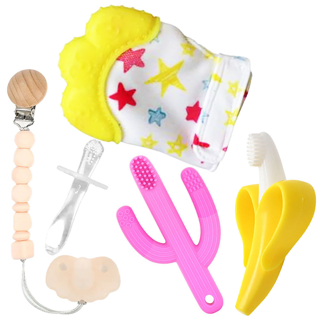 Набір силіконових прорізувачів 2Life банан рукавичка щітка Жовтий і ланцюжок з соскоюкактус Рожевий