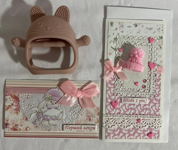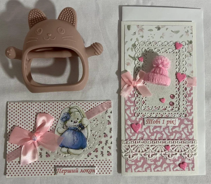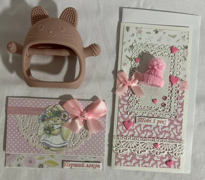 Набір листівка на 1 рік листівка Перший локон і гризунок для зубів рожевий (5021)
