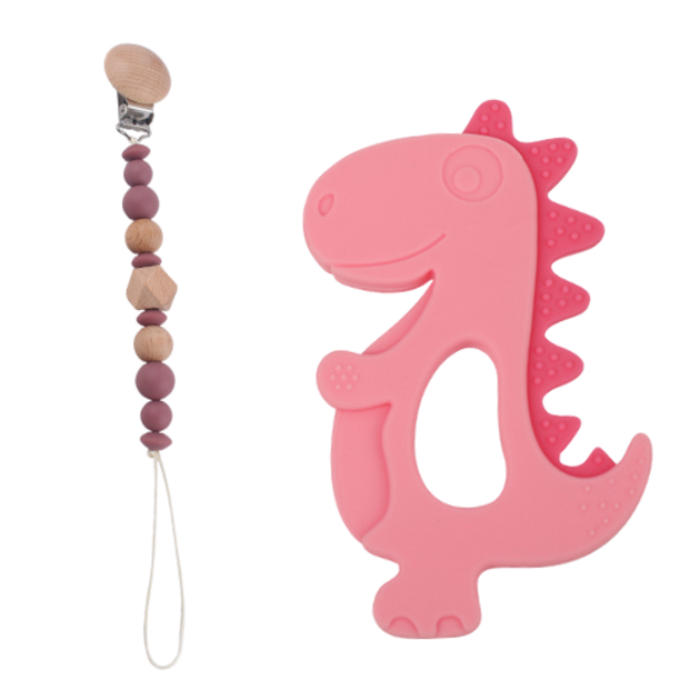 Набір силіконовий прорізувач Діно Рожевий з ланцюжком утримувачем силікон дерево Марсала v-12758