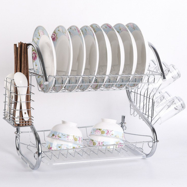 Двоярусна біла сушарка для посуду для розміщення на столі 46.5 см з піддоном, Люкс