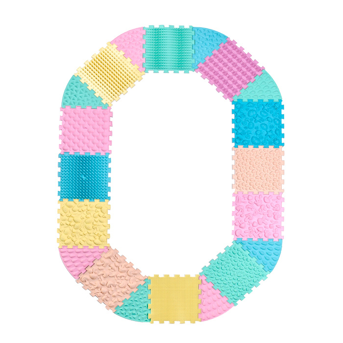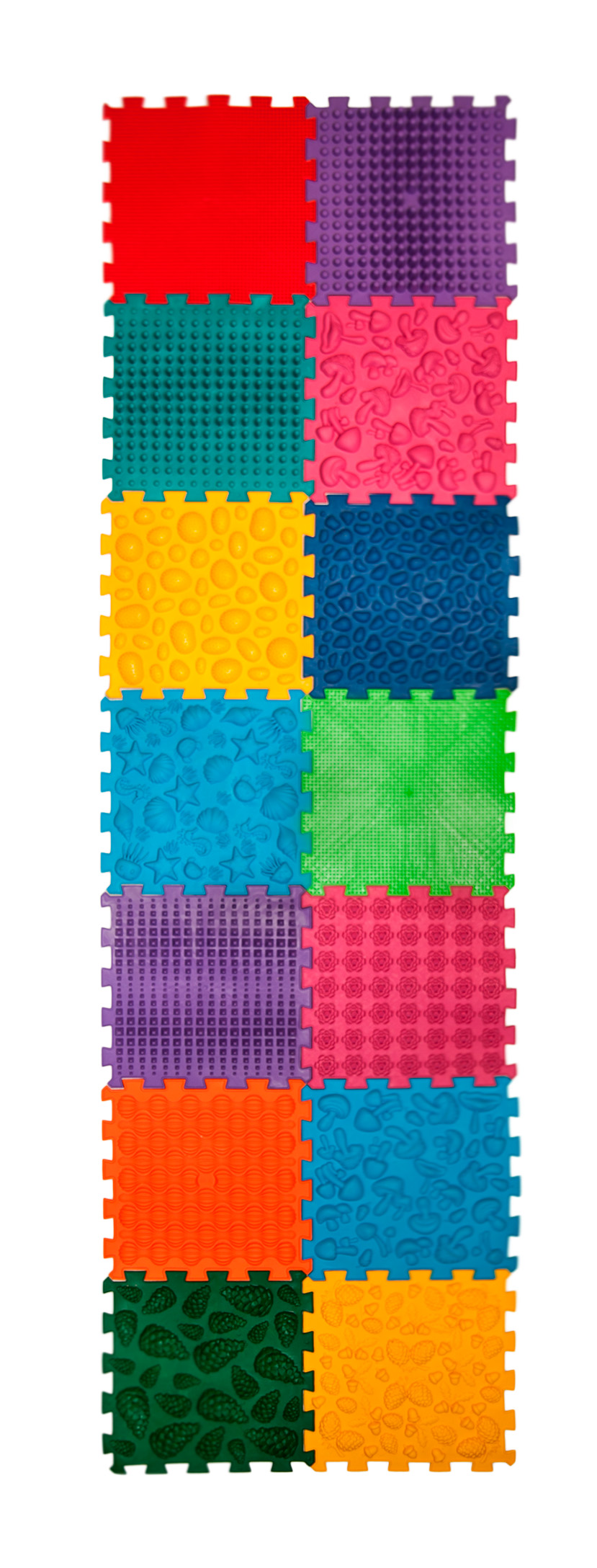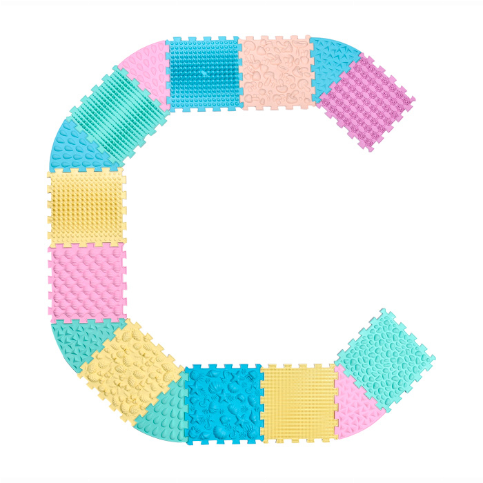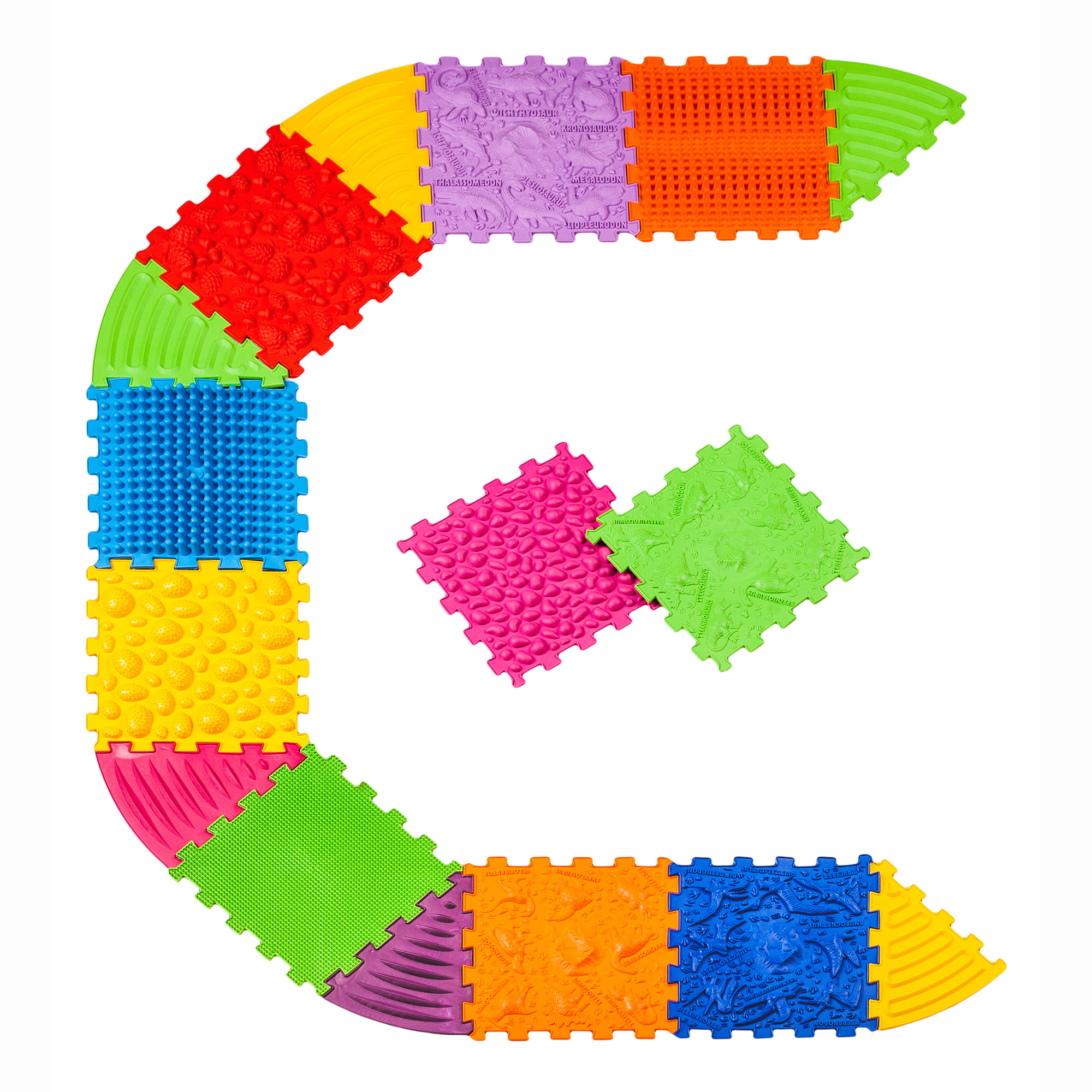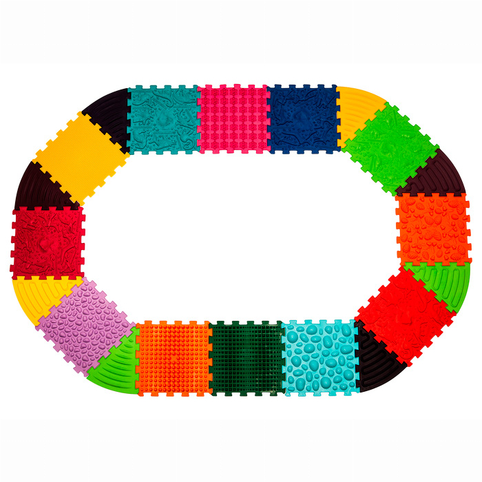 Що може масажний килимок: сприяє правильному формуванню дитячої стопи; покращує тонус м’язів, зміцнюючи повздовжнє і поперечне склепіння стопи; активно впливає на покращення кровообігу; знімає напругу в ногах, впливаючи на нервові закінчення. Набори із трикутними поворотними пазлами дозволяють створювати хвилясті доріжки, круги, візерунки, перетину. Таким чином ви зможете