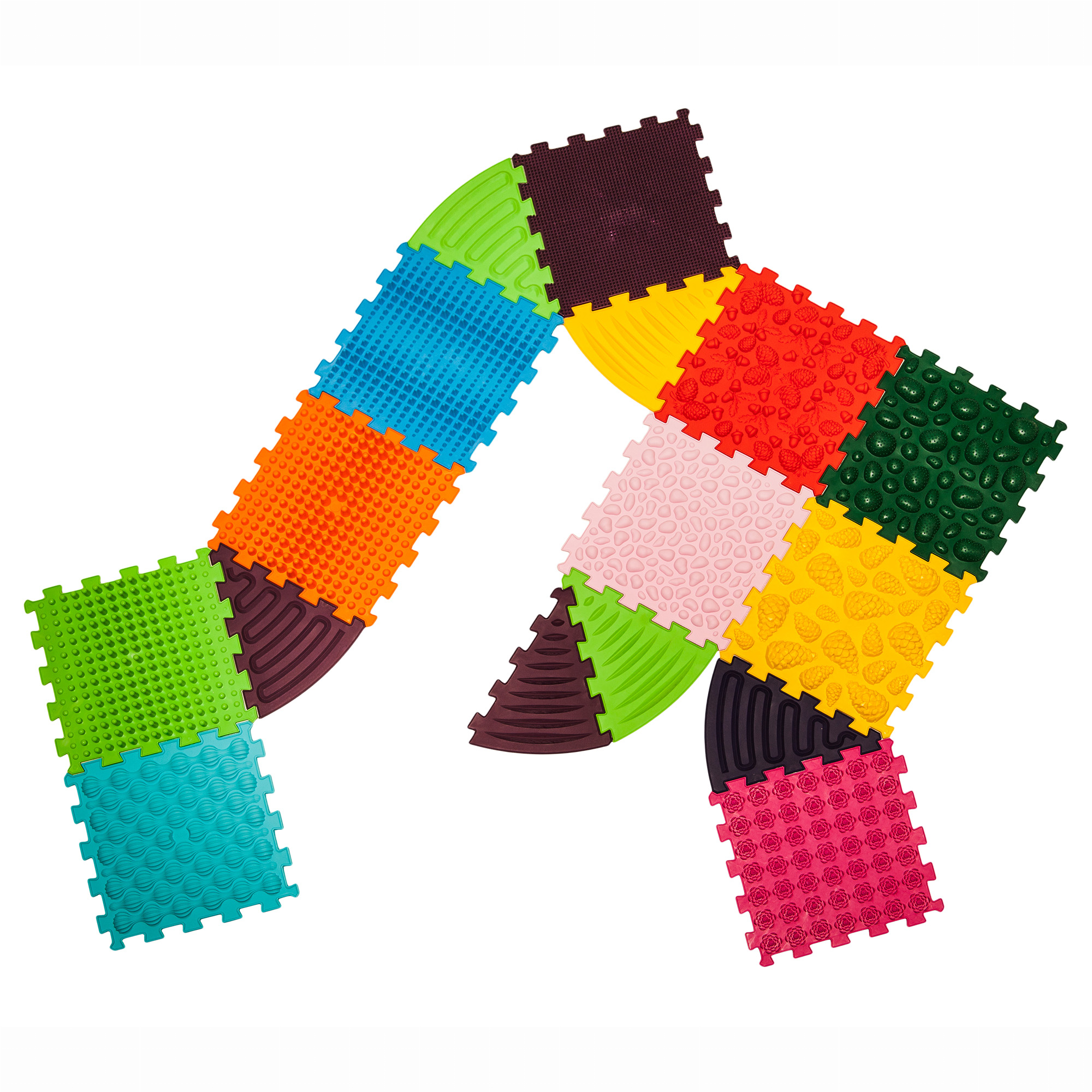 Що може масажний килимок: сприяє правильному формуванню дитячої стопи; покращує тонус м’язів, зміцнюючи поздовжнє та поперечне склепіння стопи; активно впливає на покращення кровообігу; знімає напругу в ногах, впливаючи на нервові закінчення. Набори з трикутними поворотними пазлами дозволяють створювати хвилясті доріжки, кола, візерунки та перетини. Таким чином ви