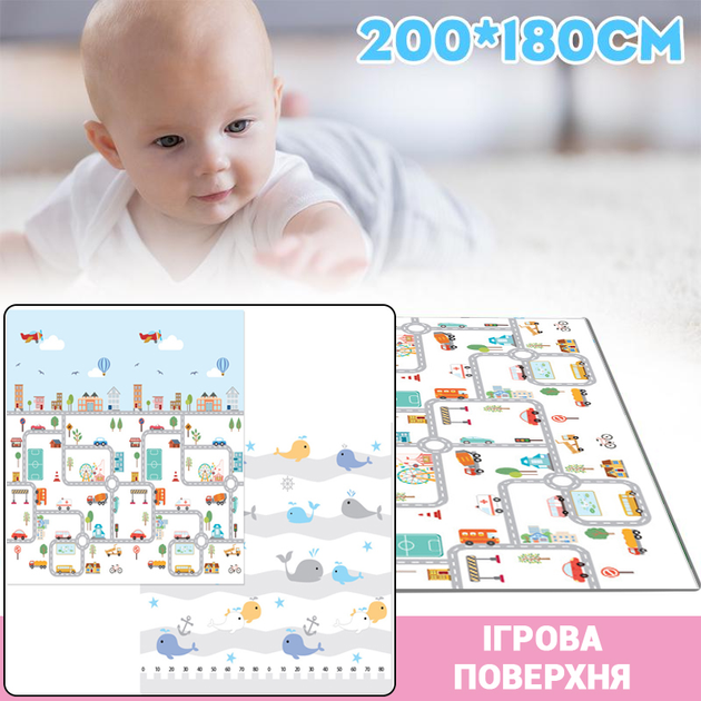 Килимок дитячий ігровий двосторонній вологовідштовхувальна поверхня для малюків Crawling Mat Місто та Океан 180х200см товщин